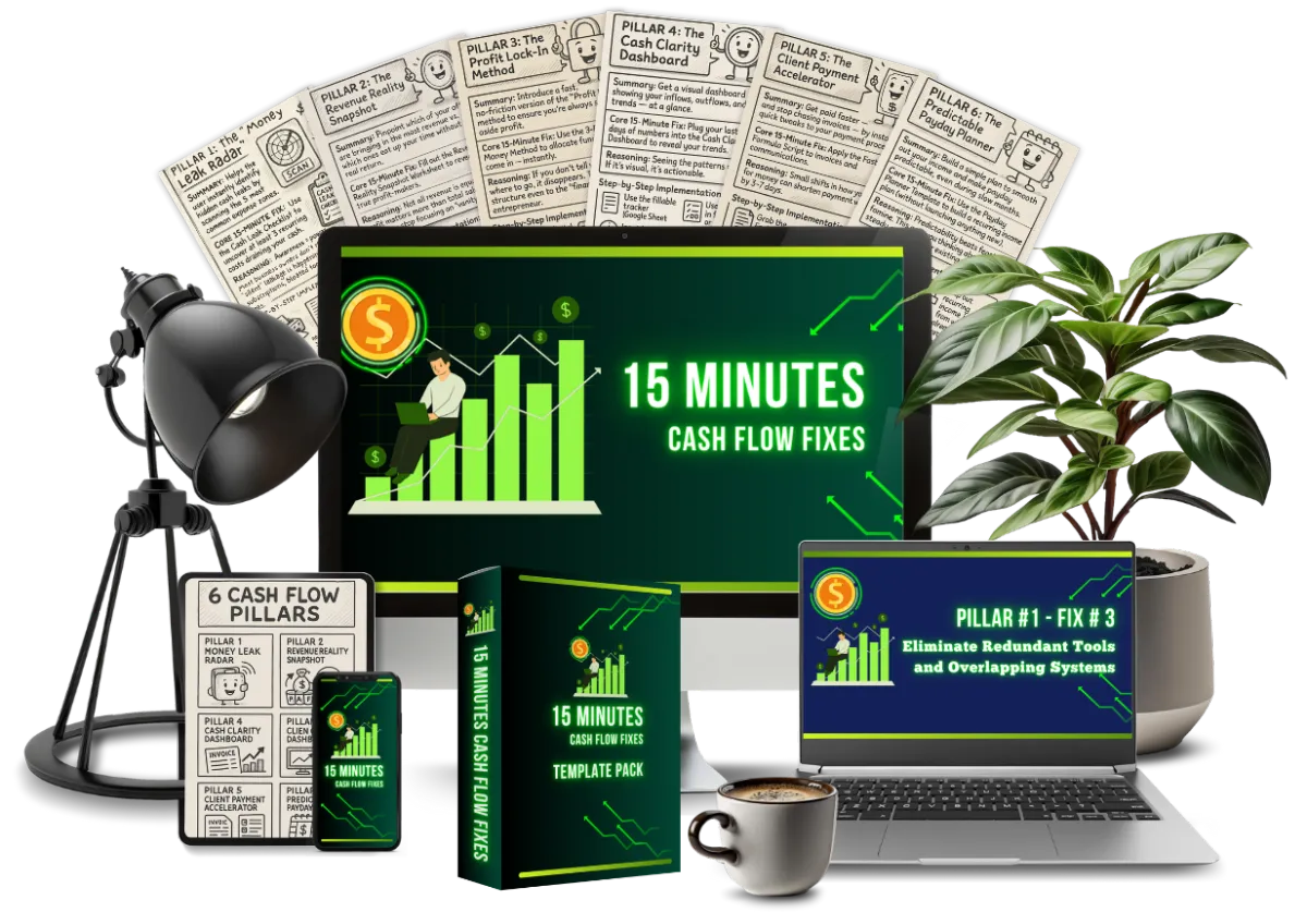 The 15-Minute Cash Flow Fix is a step-by-step program designed to help business owners take control of their money, plug hidden profit leaks, and build a system for consistent income — using fixes you can implement in 15 minutes or less.